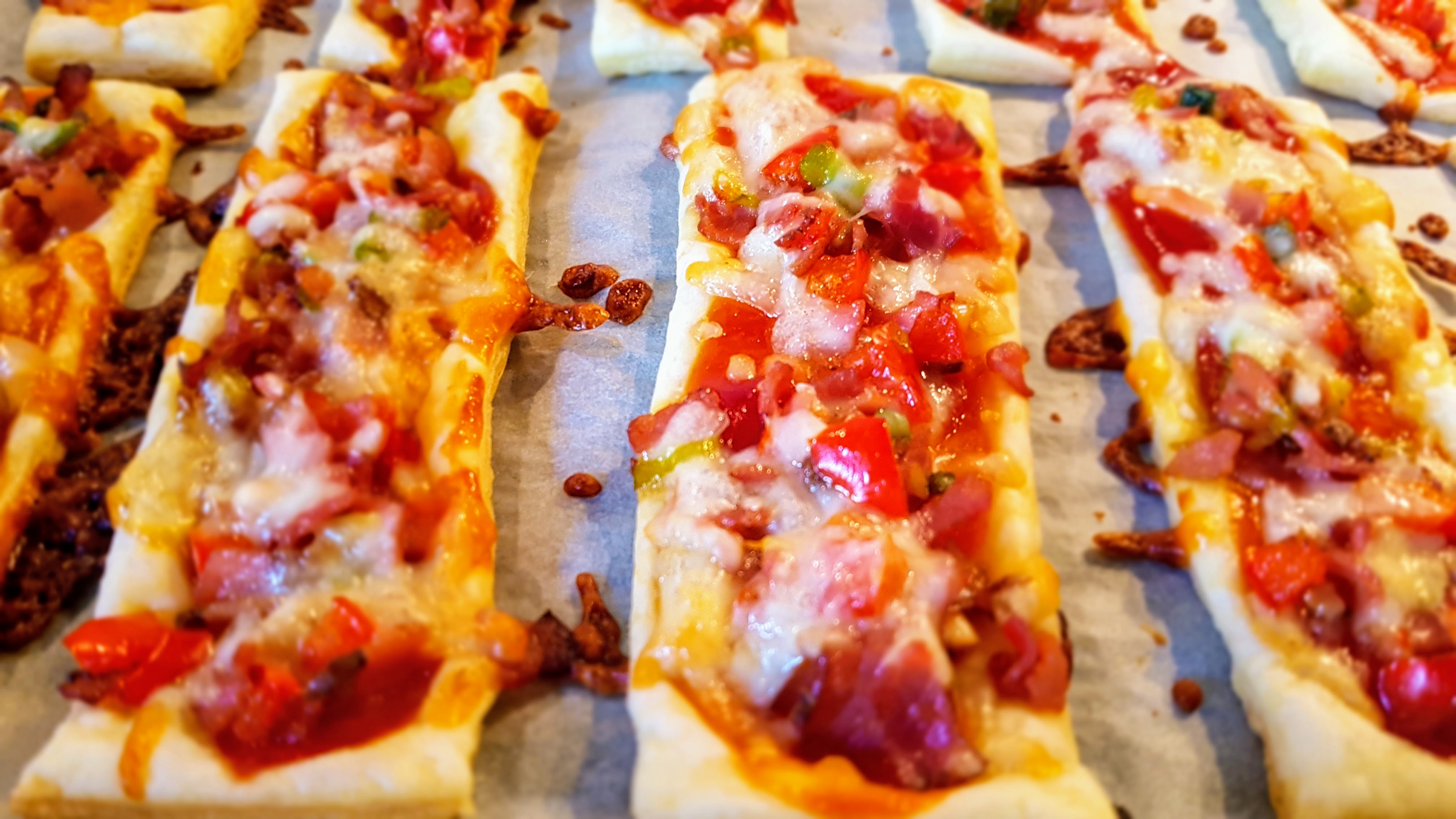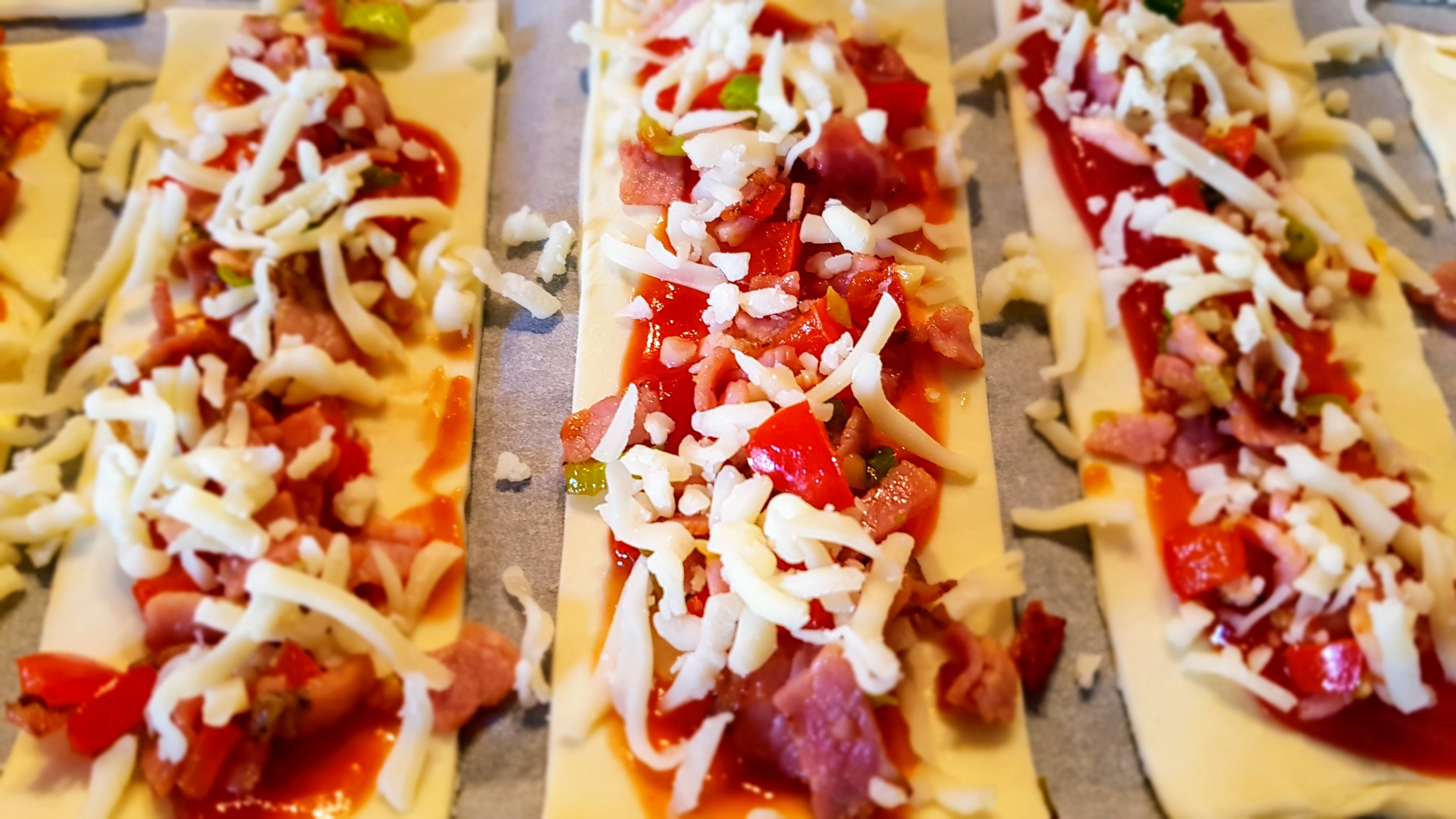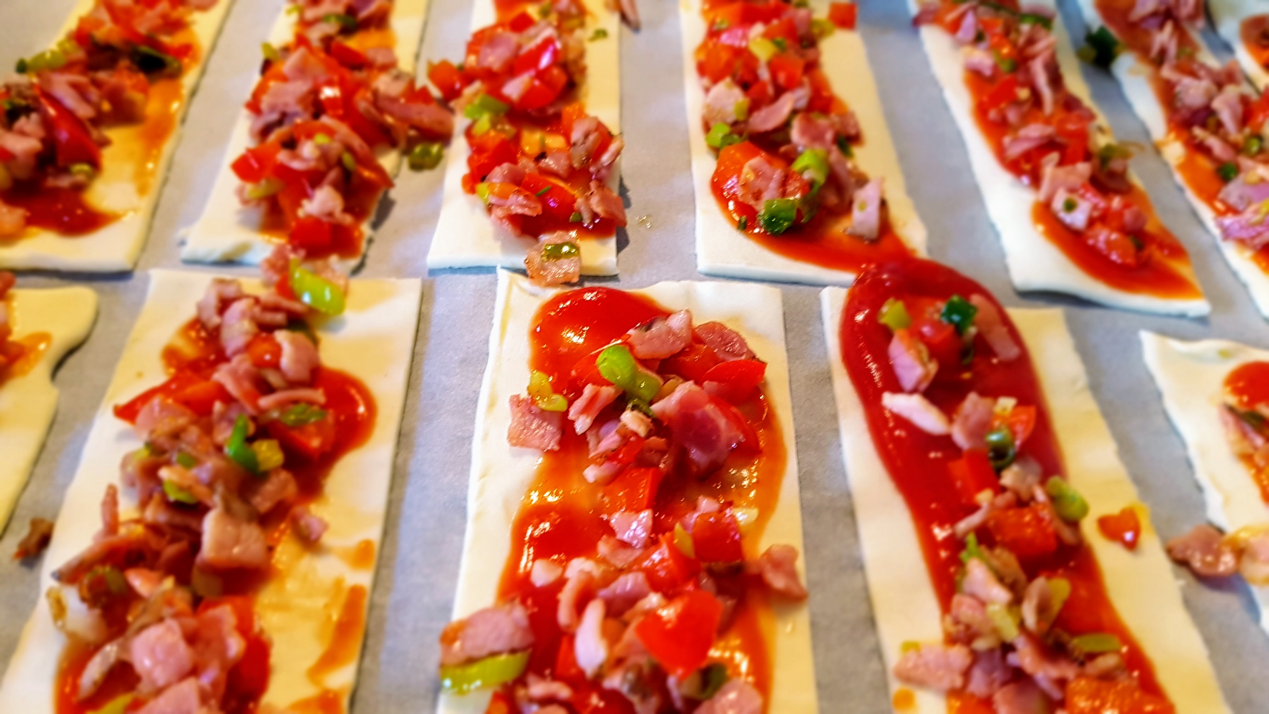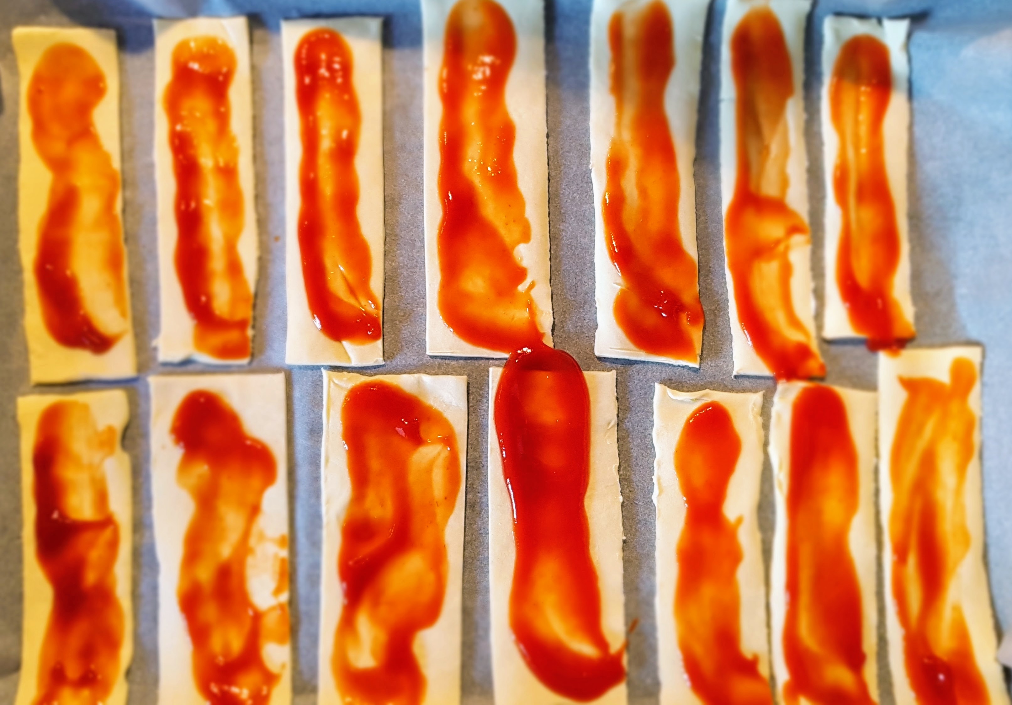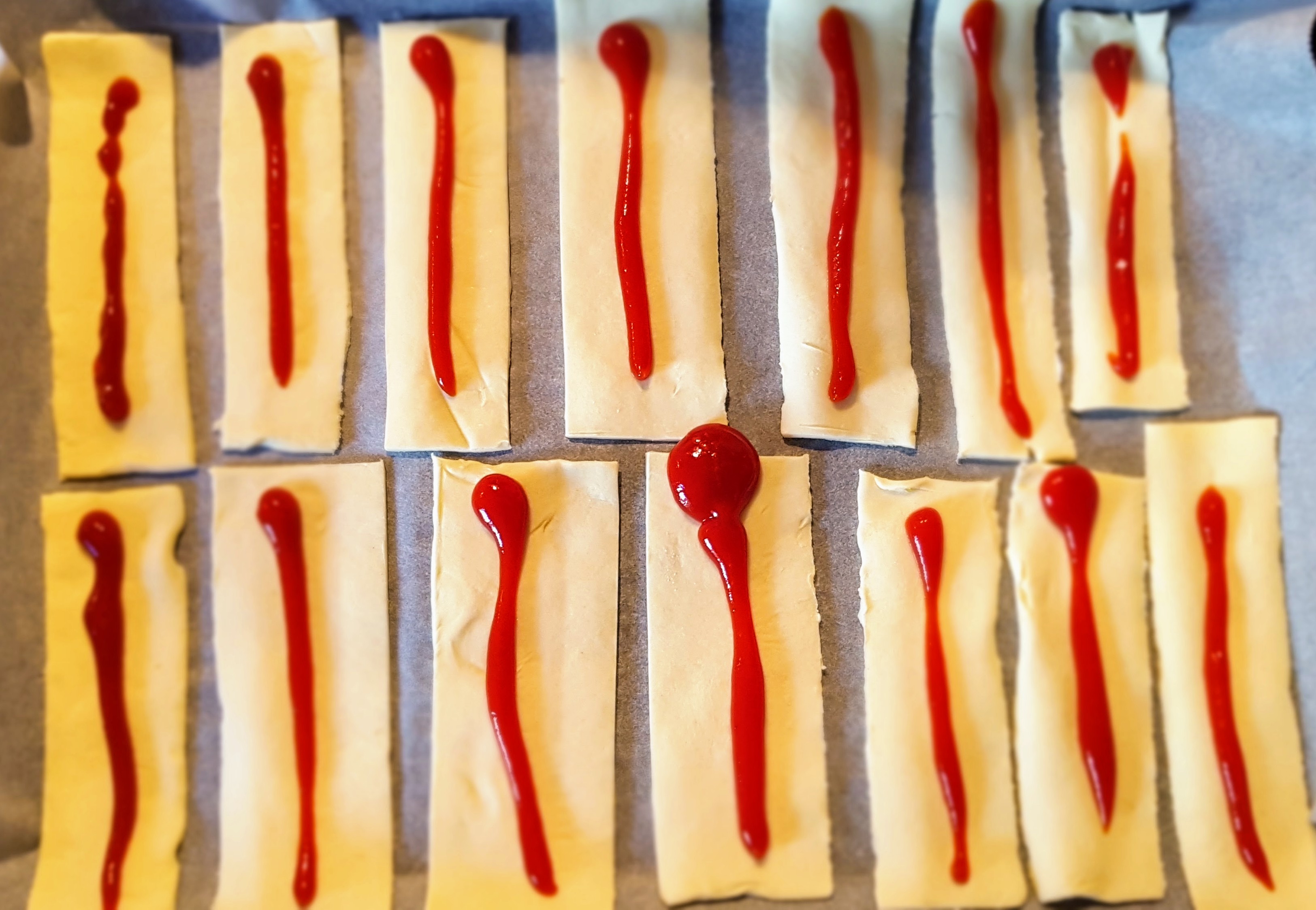 Am taiat aluatul de foietaj in fasii si le-am "pictat" cu ketchup