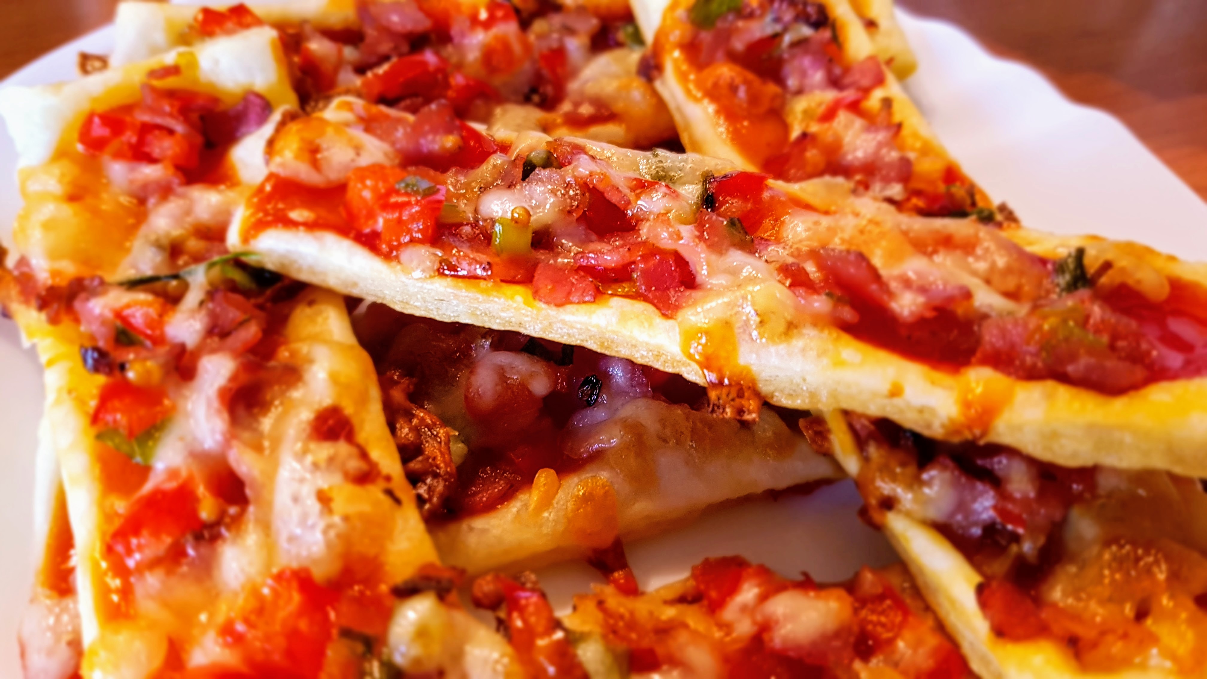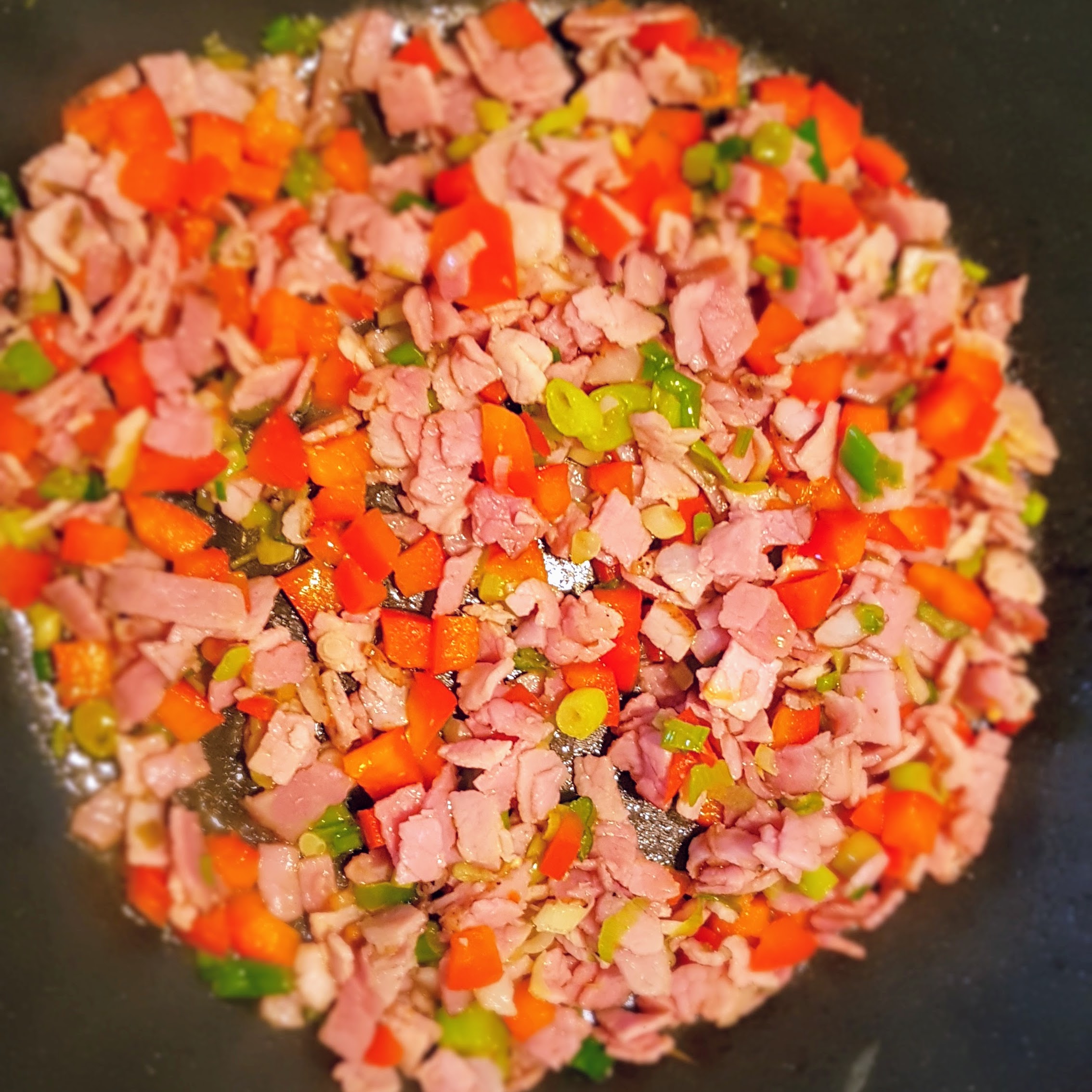 Am revenit la tigaie si am asezxat cu grija compozitia din ceapa verde, ardei si jambon pe fiecare fasie