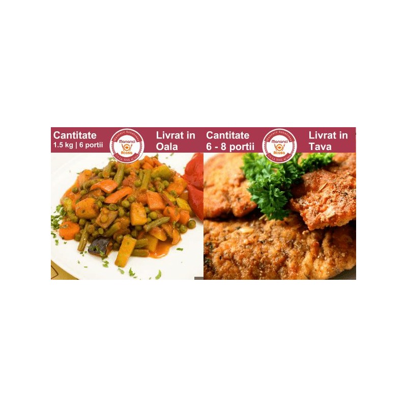 Meniul contine: o Oala de 1.5 kg cu Ghiveci de Legume si 1 Tava de 1 kg de Snitele de Pui